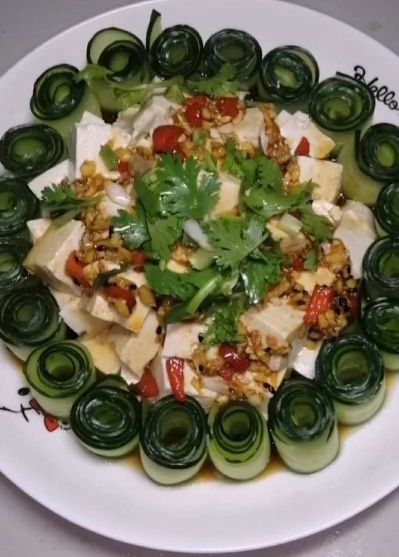 2:黄瓜切薄片卷起把豆腐围在中间。
