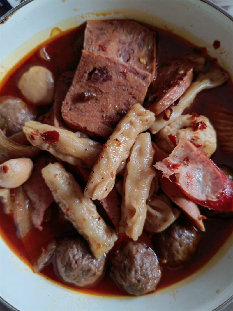 牛肉丸10个;虾饺10个;火腿肠1根;红肠1根;冷冻肉丸10个;红薯粉100g;午餐肉5块;