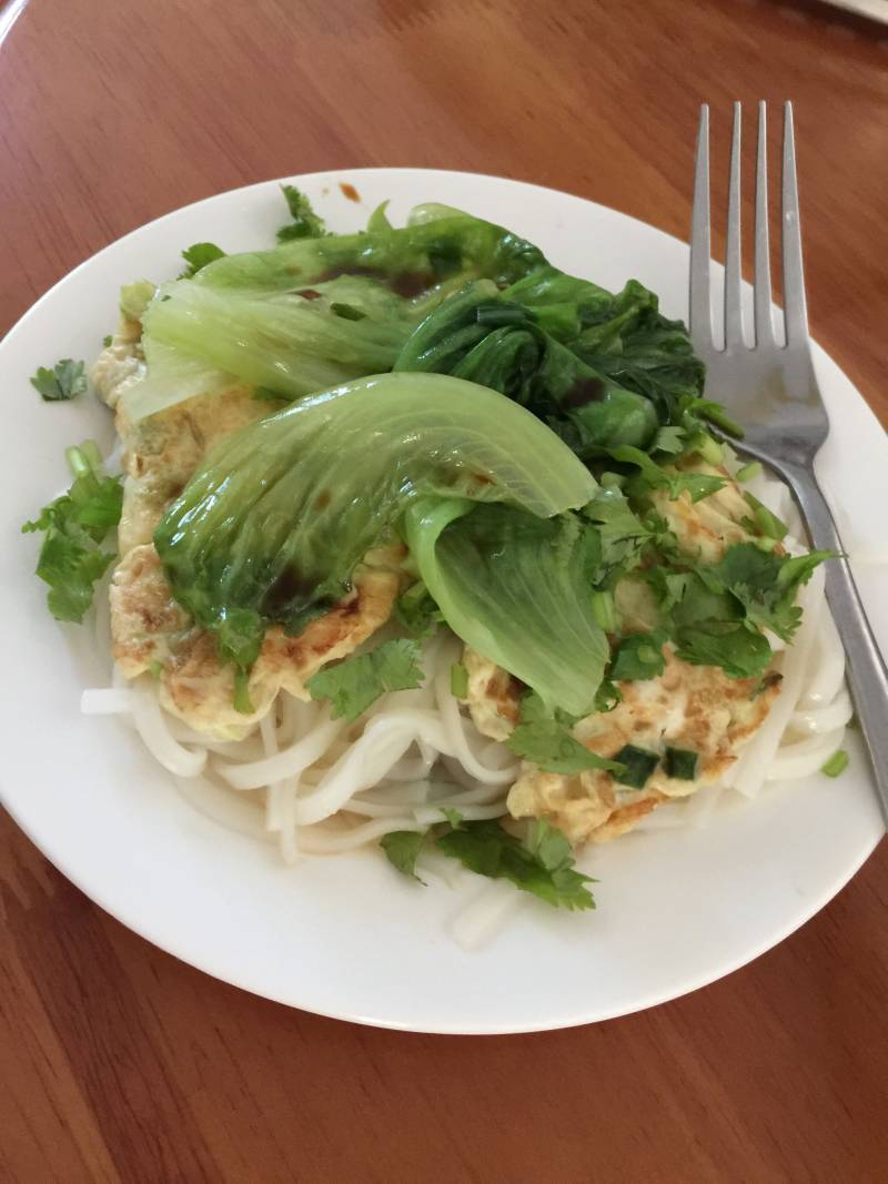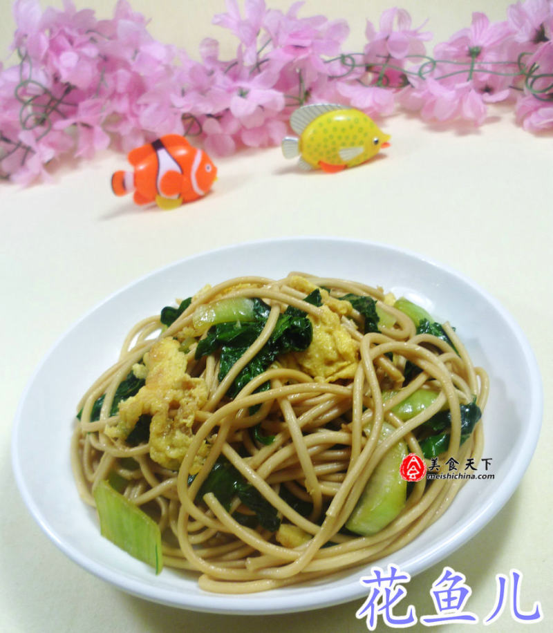 3:煎好后倒在面条上面,生菜也一样再洒上酱油美味健康的青菜鸡蛋面就做好了