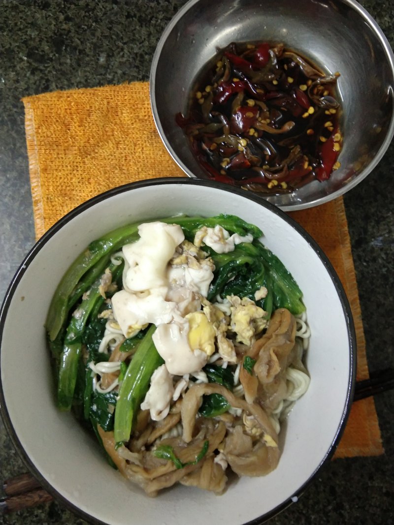 6:最后加2大勺开水,搅拌均匀,面条汤汁就调好了;家里有鸡汤和排骨汤的,味道会更好了。