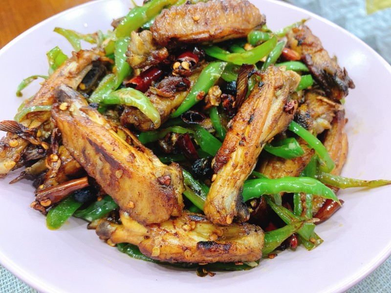9:利用刚刚煎过鸡翅的锅把辣椒炒蔫备用。