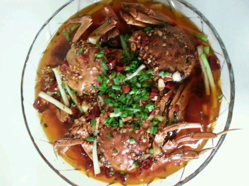 7:同样热锅加油烧至9层热放入生姜粒,花椒,辣椒翻炒两下放入红油豆瓣酱(这是我的法宝,婆子妈亲手自制的。)倒入酱油和红油辣椒,然后放盐和蒸好的蟹,烧5,6分钟左右起锅时放入鸡精和切好的葱白和大蒜粒。
