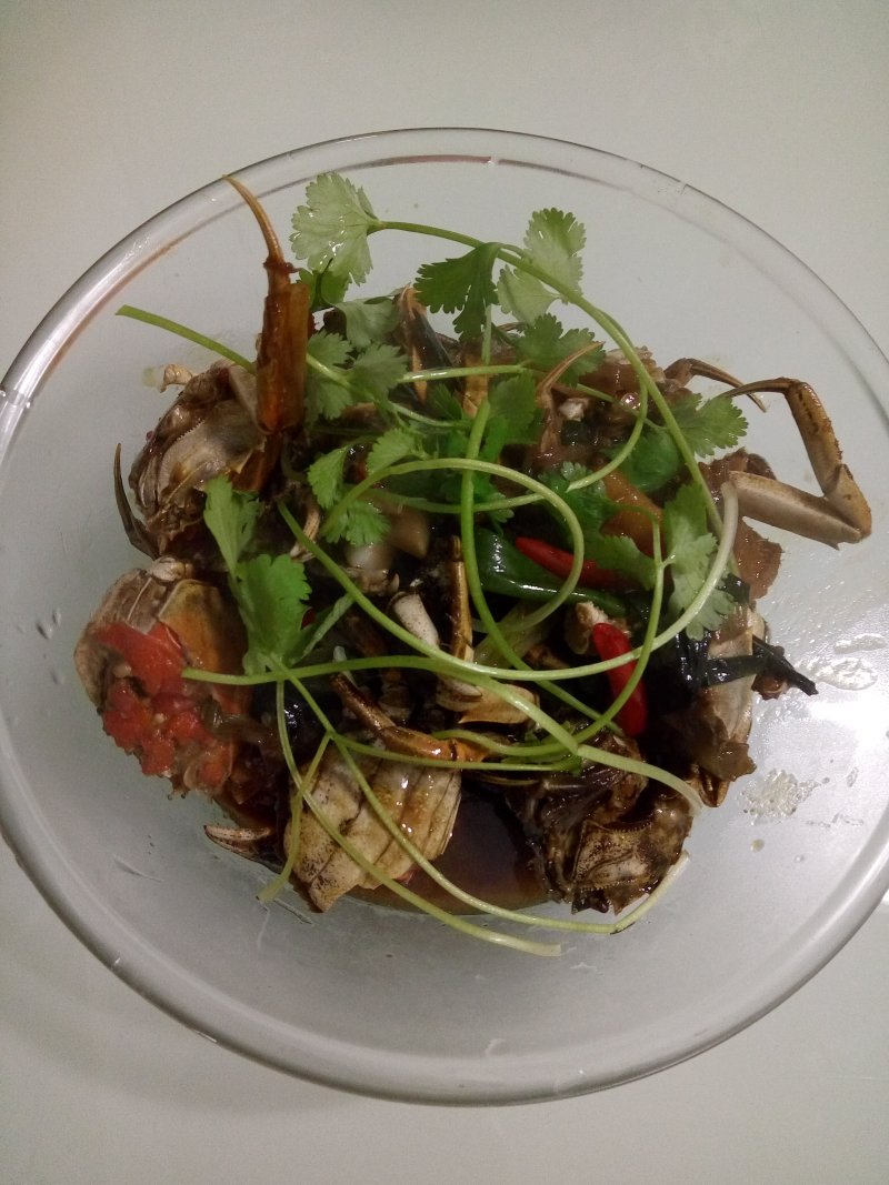 6:放入洗好的螃蟹,盖上锅盖,焖上十分钟,等汤汁快收干时放入香菜。