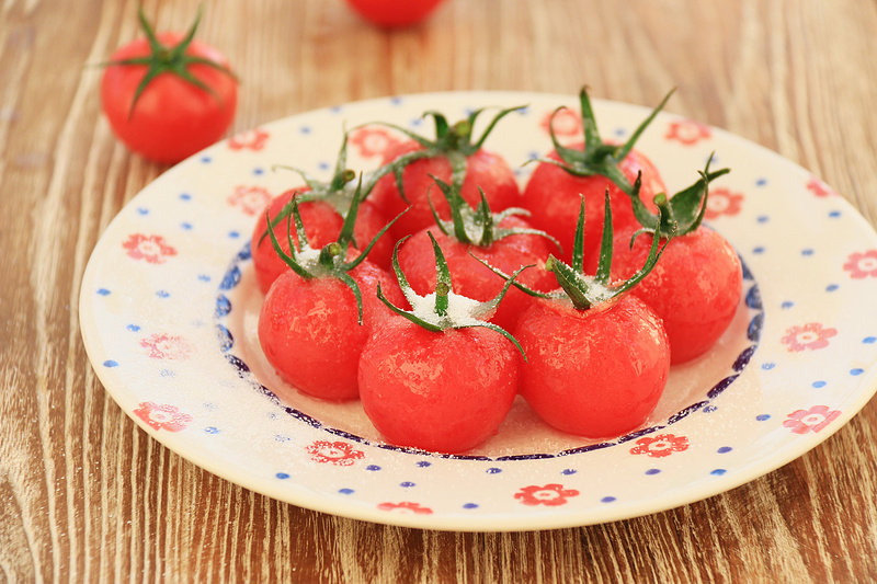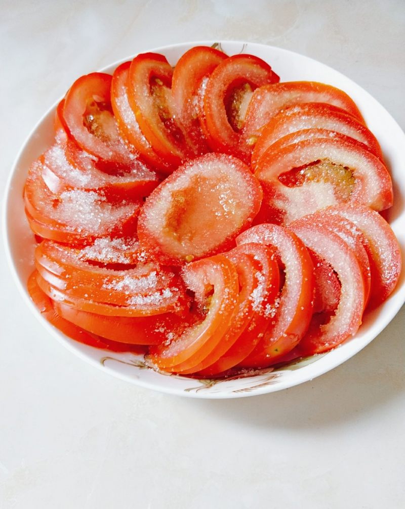 2:在番茄上撒上绵白糖,等糖化开就可食用了