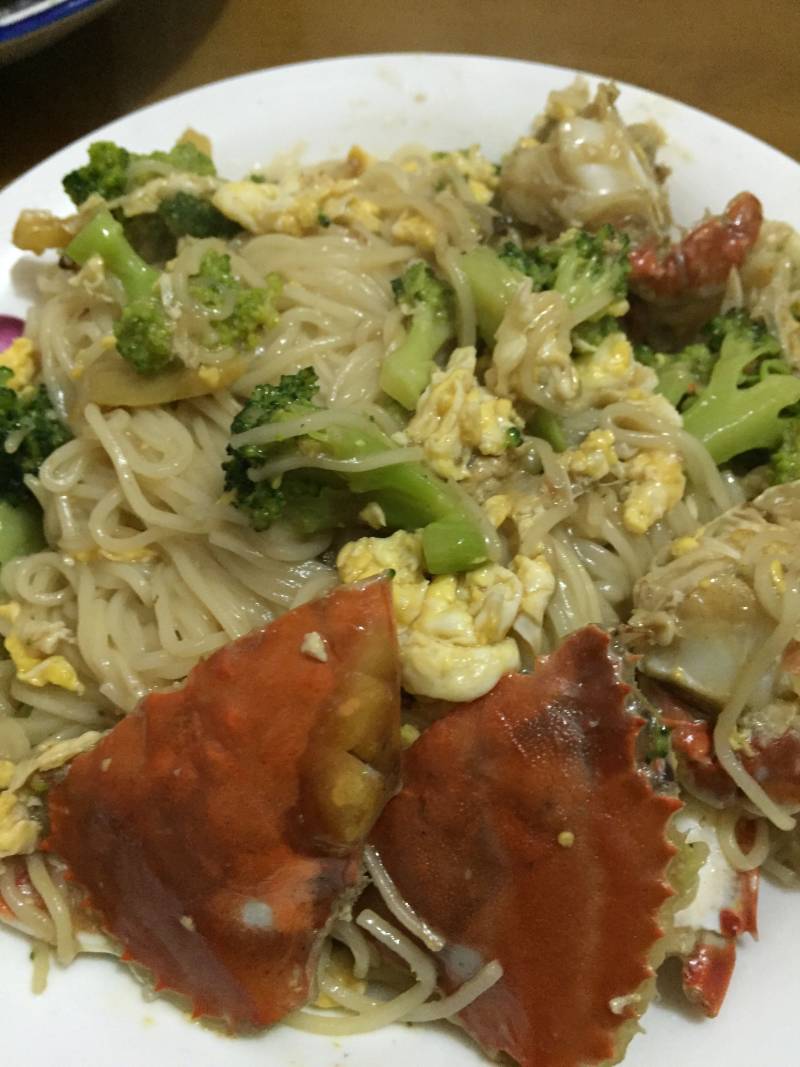 6:加少量食盐和酱油,翻炒至螃蟹9成熟,陆续放入西兰花,鸡蛋,最后捞出一边在煮的面条!用筷子搅拌.