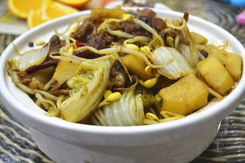 14:放入白菜,开锅后,炖制到白菜塌秧,加盐调味。
