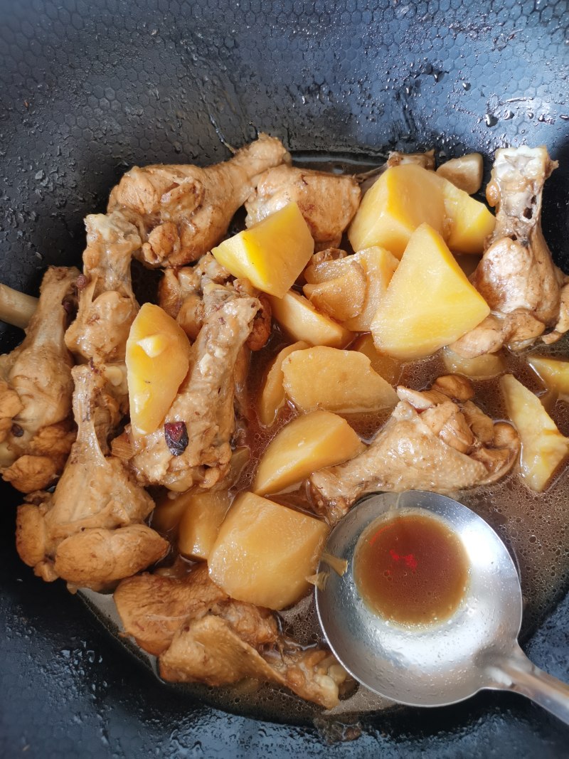 5:倒入酱油,继续翻炒几次,加开水,没过鸡翅根,大火煮开,加木耳转中火,炖15分钟。加少许盐,收汁即可。