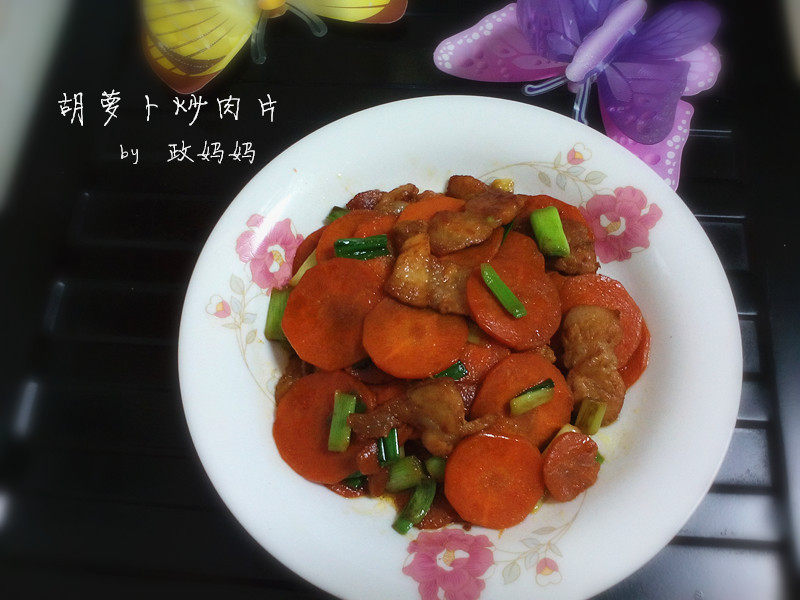 5:肉片炒至发白,把肉片拨到一边,放入胡萝卜片翻炒。