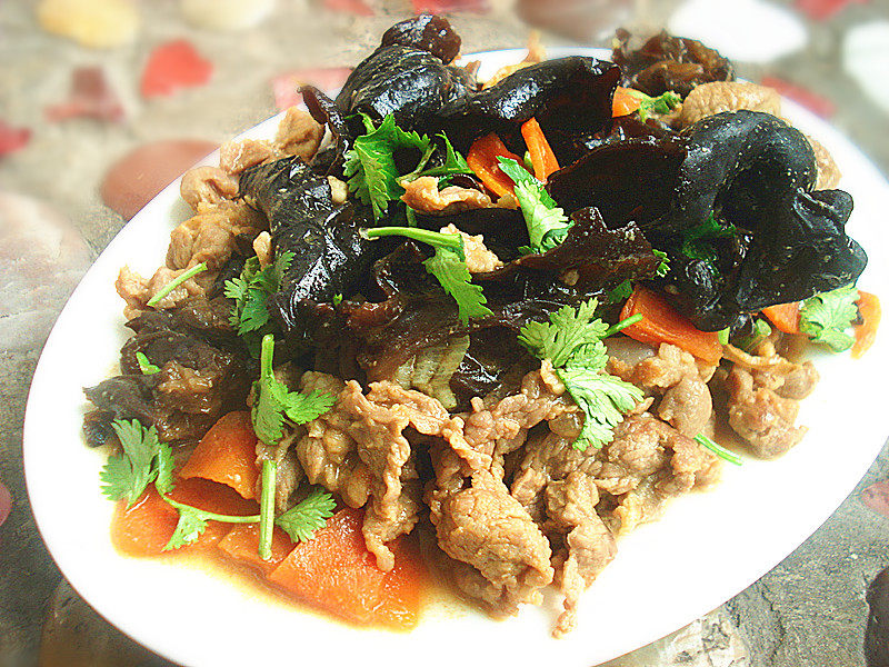 6:放入葱丝,姜丝,木耳,调入盐,老抽翻炒几下后,倒入少许水略煮片刻。