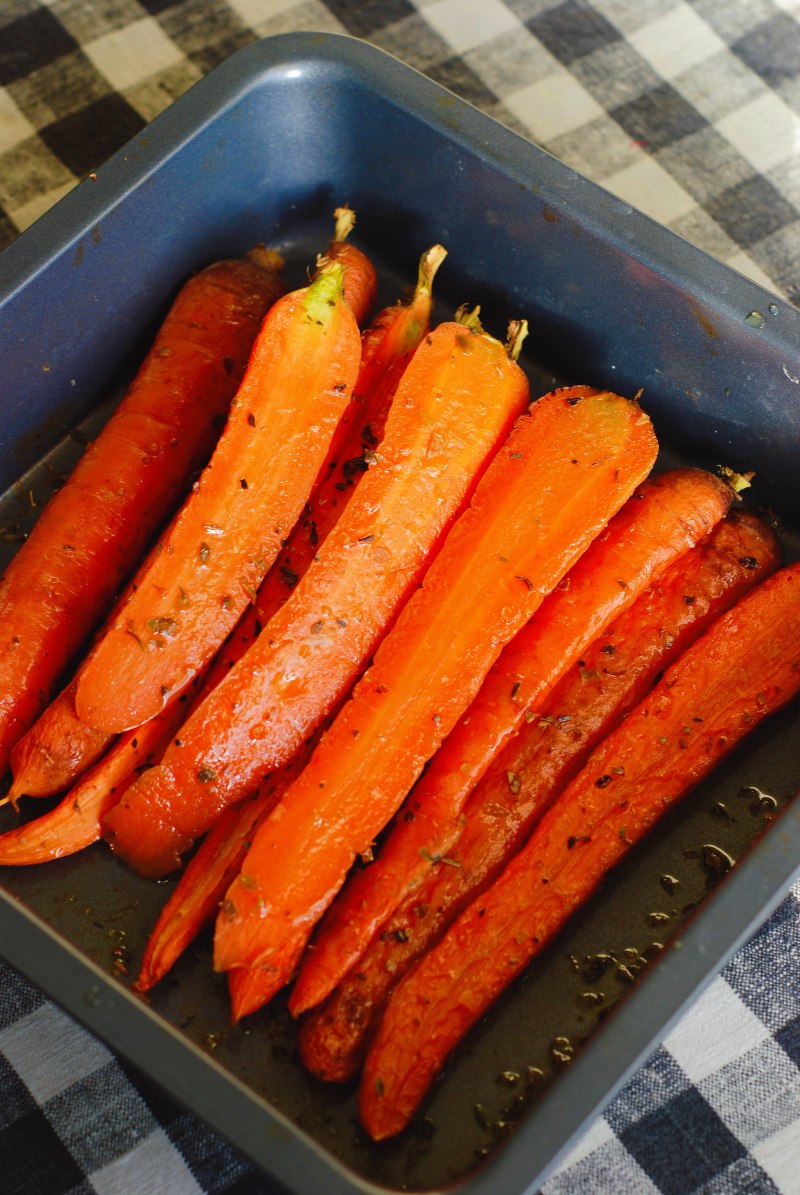 5:烤好后打开烤箱,胡萝卜的香甜混合着披萨草浓郁的香气扑鼻而来。香甜可口的烤胡萝卜就做好了,美味又营养,瞬间让你爱上它。