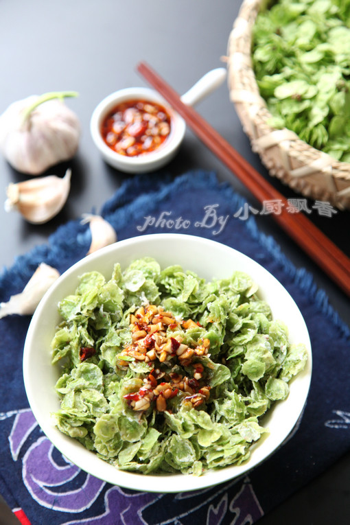 10:也可以炒制一下:炒锅放入少许底油,下葱花爆香,下入蒸好的榆钱,加入盐定好味,炒得有些发黄时下蒜末,再翻炒几下出锅即可