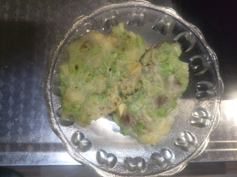 8:平底锅烧热倒入少许油将捏好的榆钱饼放入。