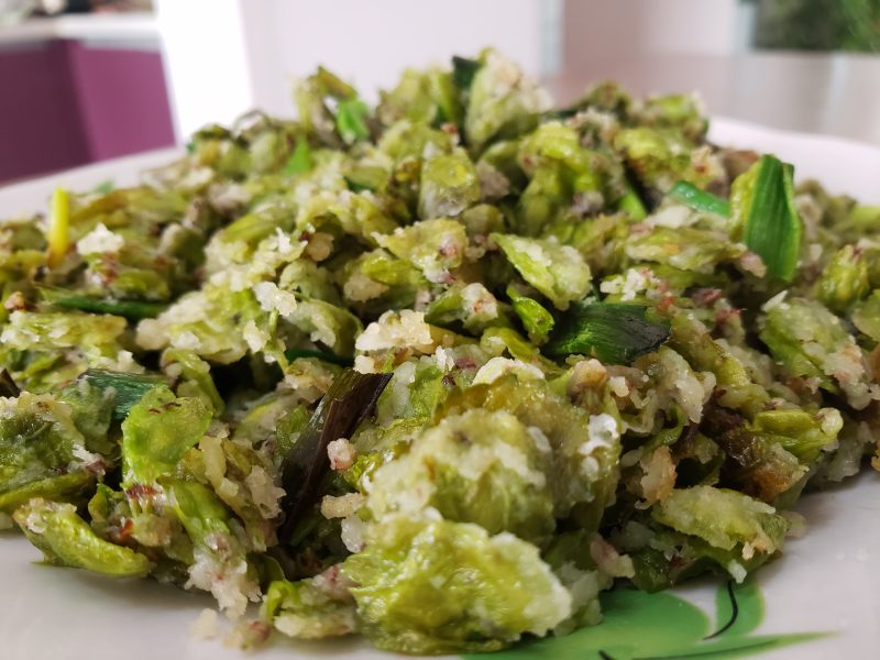 8:锅烧热放适量油,倒入蒜苗加少许盐炒香,再倒入蒸好的榆钱,翻炒几下即可。