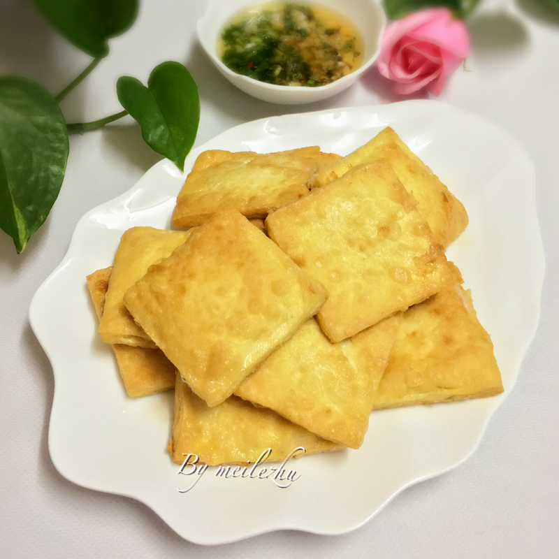 4:锅中加入油,大火烧热,放入裹了蛋液的豆腐中火煎至呈金黄色。
