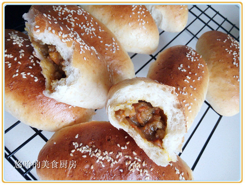 酵母3克;盐2克;黄油15克;咖喱土豆泥馅料适量;白芝麻少许;蛋液35克;