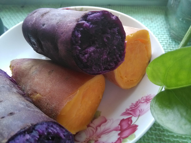 6:红薯和紫薯各50克,我是去皮后用微波炉烤熟的,大家可以微波也可用蒸的方法。