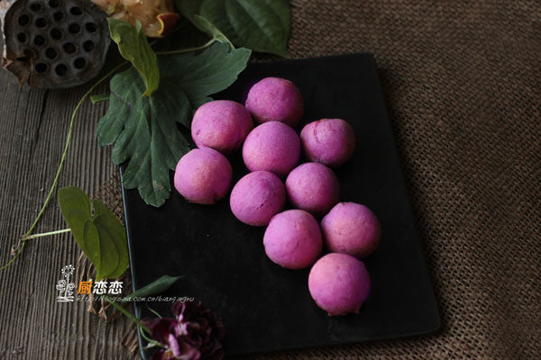 2:紫薯洗净、蒸熟、撕皮,用勺子压碎,尽量细一些。