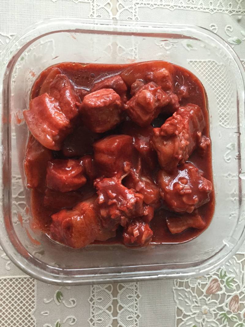 3:加入泄开的玫瑰腐乳。就是腐乳块要用腐乳汁泄开再用。