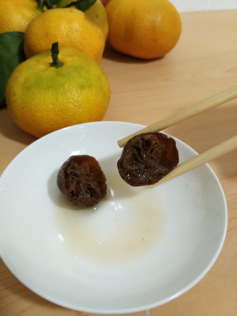 7:腌制十年的如图,液体如糖浆,底有结晶,果身柔软,呈黄黑色,可食用
