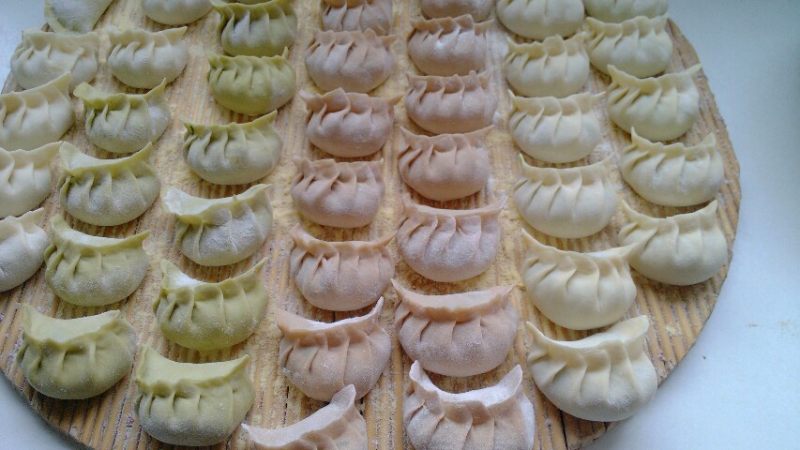 5:下成剂子,擀成饺子皮。我还用抹茶粉和可可粉和了一些面,忘了拍照啦。