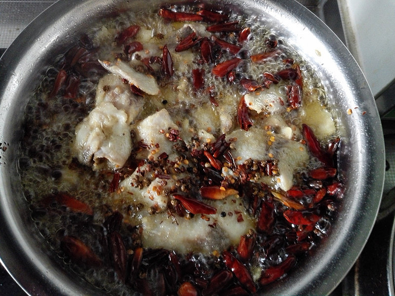 15:等辣椒变色后我们用小笊篱把辣椒花椒麻椒捞到鱼盆中。这个时候的油温不够,所有我们要大火把油加热至微微冒烟,不能冒大烟,那样浇在辣椒上辣椒就糊了,这个油温很重要。