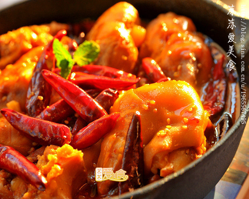 5:5、再放入提前泡好的干辣椒爆香,倒入白芝麻炒香,倒入泡辣椒的红水煮沸腾,再放猪蹄翻炒几下出锅。