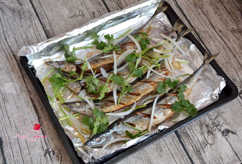 秋刀鱼用料简单,只需用盐略微腌一下,便可进烤箱烤,如果能用碳烤效果更佳,鱼肉细密紧致;中途取出,刷一层蚝油黑胡椒粉的混合液,是为了增加味道;洋葱丝和香菜段可以随口味添加,生食即可。
