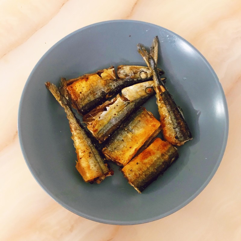 5:大火,下油,油热后放入秋刀鱼,煎至金黄。