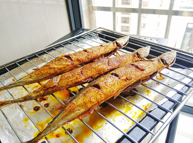 4:烤箱预热200度,烤盘铺锡纸,秋刀鱼放烤架上,放之前鱼二面都刷一层油;
