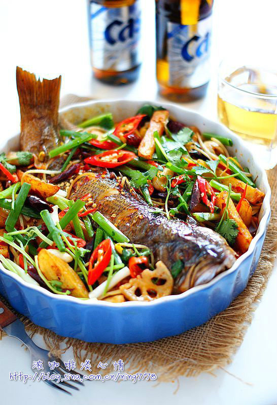 17:在装鱼的烤盘中先放入香菜,再依次放入煮好的干豆腐、豆芽、炸好的土豆、莲藕、连同煮料汤一起倒入烤盘中,汤汁最好多一些,以漫过鱼的1/2处为佳。
