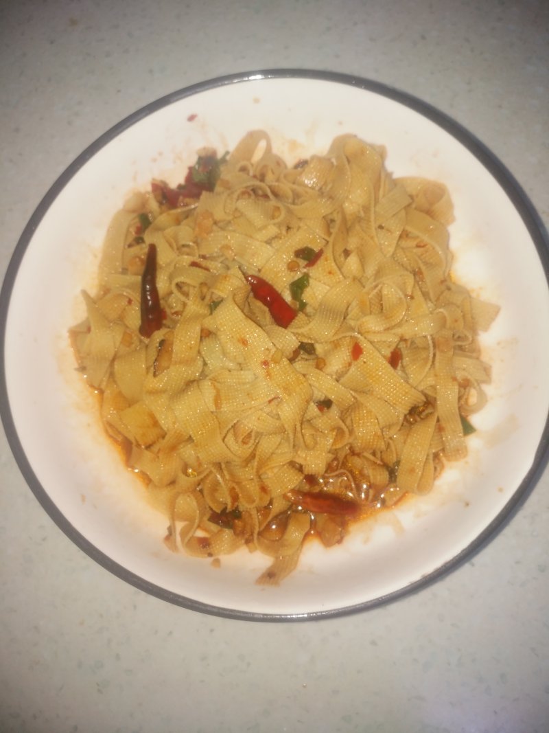 1:准备食材:2张千张切成丝,葱姜蒜末和干辣椒段准备好。