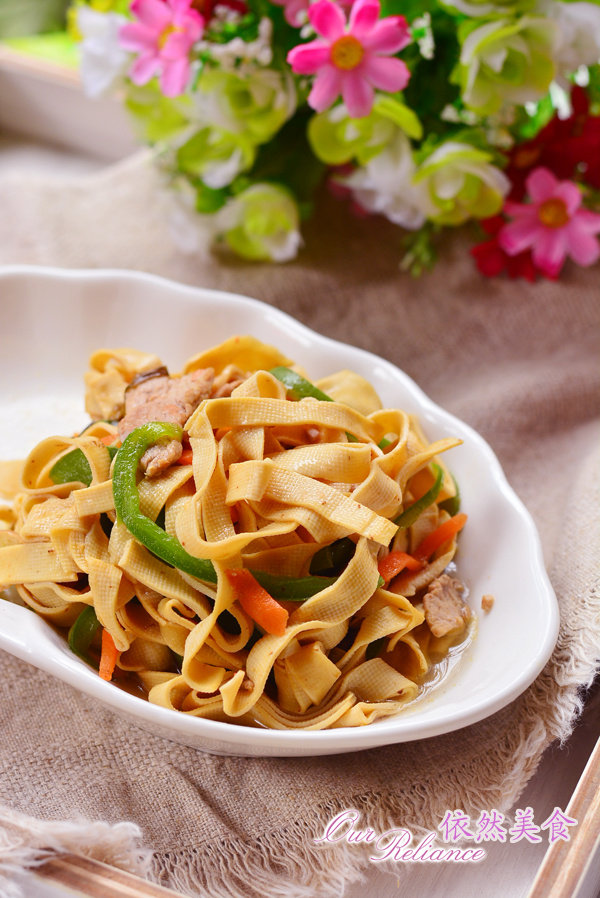 1:千张450克胡萝卜半根青椒半个里脊肉150克生姜一小块大蒜1瓣调和油适量泰式甜麻辣酱1汤匙耗油适量蒸鱼鼓油适量盐巴味精适量