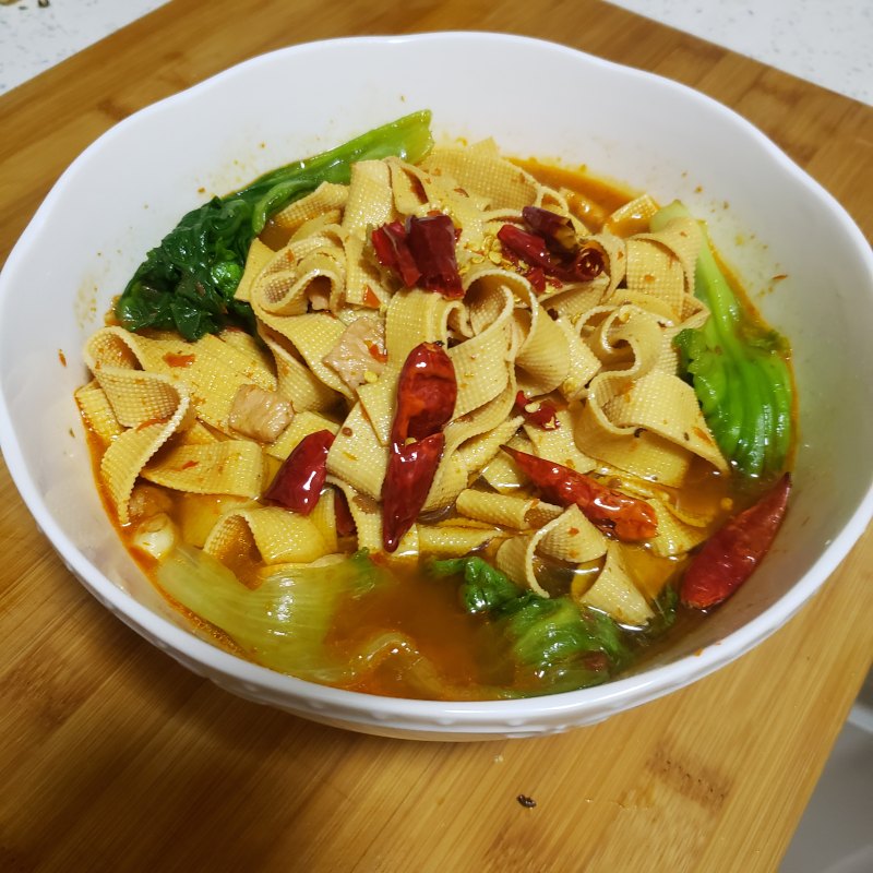 5:锅中倒水煮开,再下入豆腐皮煮上5分钟。