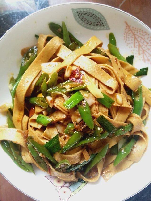 3:倒入均匀切成丝的千张翻炒,加盐、鸡精、酱油、花椒油