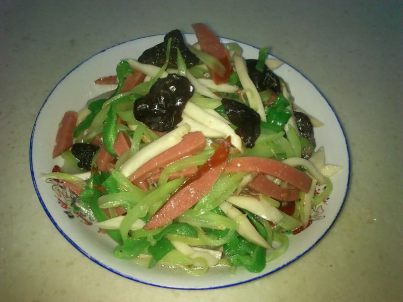 2:热锅倒油,下葱姜爆香,倒入莴笋丝木耳,翻炒均匀。