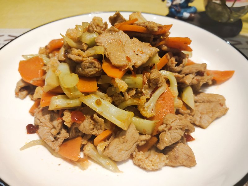 2:胡萝卜和瘦肉切薄片,花菜切小块,大蒜切碎备用。