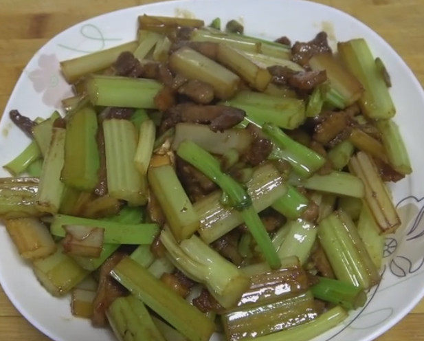 6:再加入芹菜大火翻炒,半分钟后加入糖,盐炒至芹菜断生入味即可。