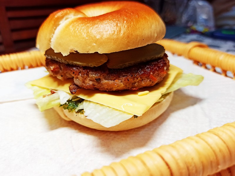 13:最后放上贝果,用油纸包起来。好吃的牛肉贝果汉堡就做好了!开动。