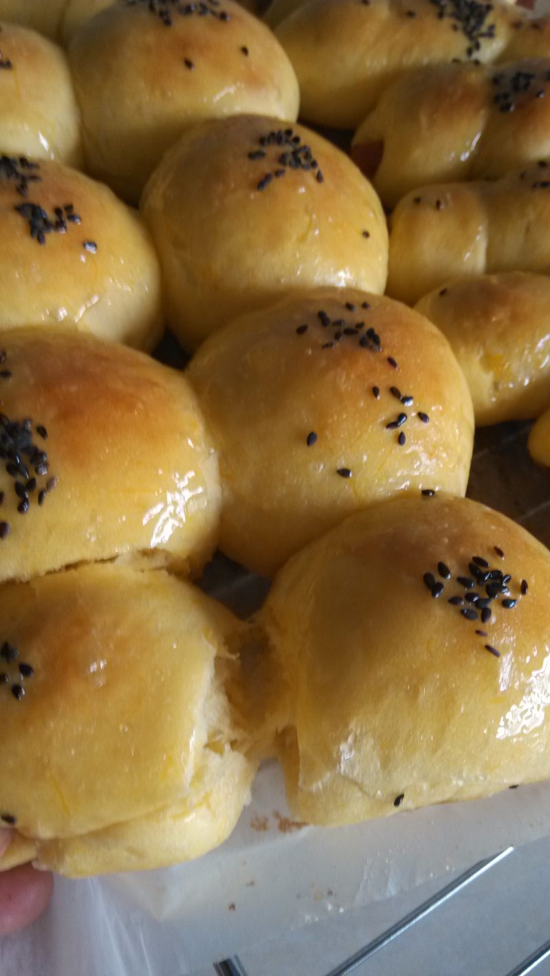 7:依次做好后放入烤箱发酵,底下放入一碗水,发酵40分钟至两倍大,将面包和水全取出,这步忘记拍了。这烤箱上下预热150度,这时可以在面包上刷一层蛋液,在上面洒上黑芝麻,放入第三层下火调到130度上火不动。烤15分中左右