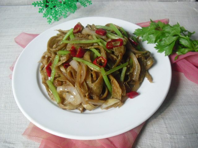 2:豆筋用开水泡软,现吃现泡,几分钟就可以用了。