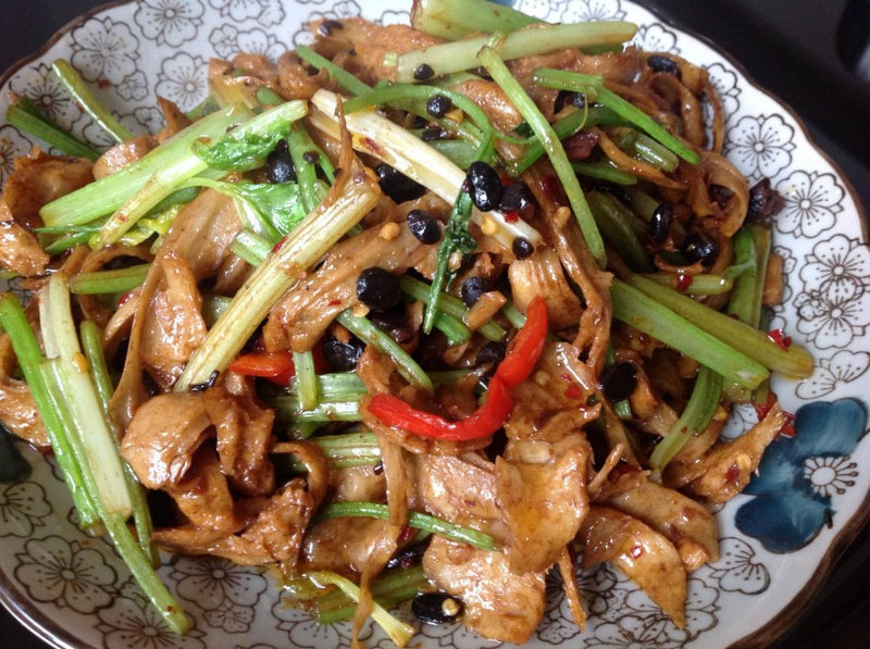 2:热锅冷油,加一点姜末,倒入面筋翻炒,加入一点老抽,二勺生抽,二勺俺家秘制的豆豉肉丁酱,翻炒均匀,下入芹菜和红辣椒,看芹菜断生就可以装盘了