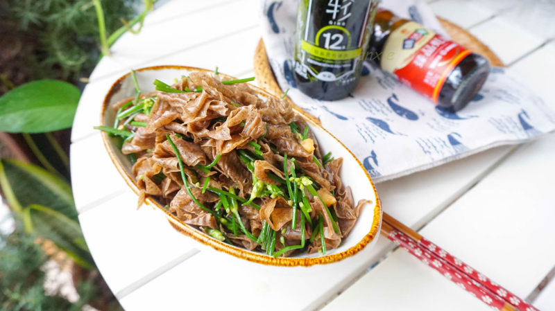 这道菜中的豆筋和韭菜苔,并没有主料和配料的区别,多一点儿少一点儿都是可以的。生抽和蚝油搭配可以做各种小炒的调味料,按生抽蚝油1.5:1或者1:1都是可以的,味道非常鲜美。