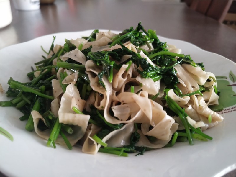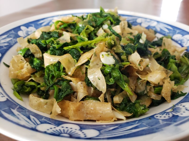 3:泡好的豆筋切段,锅中放油烧热,放入香菜和豆筋翻炒,调味出锅。