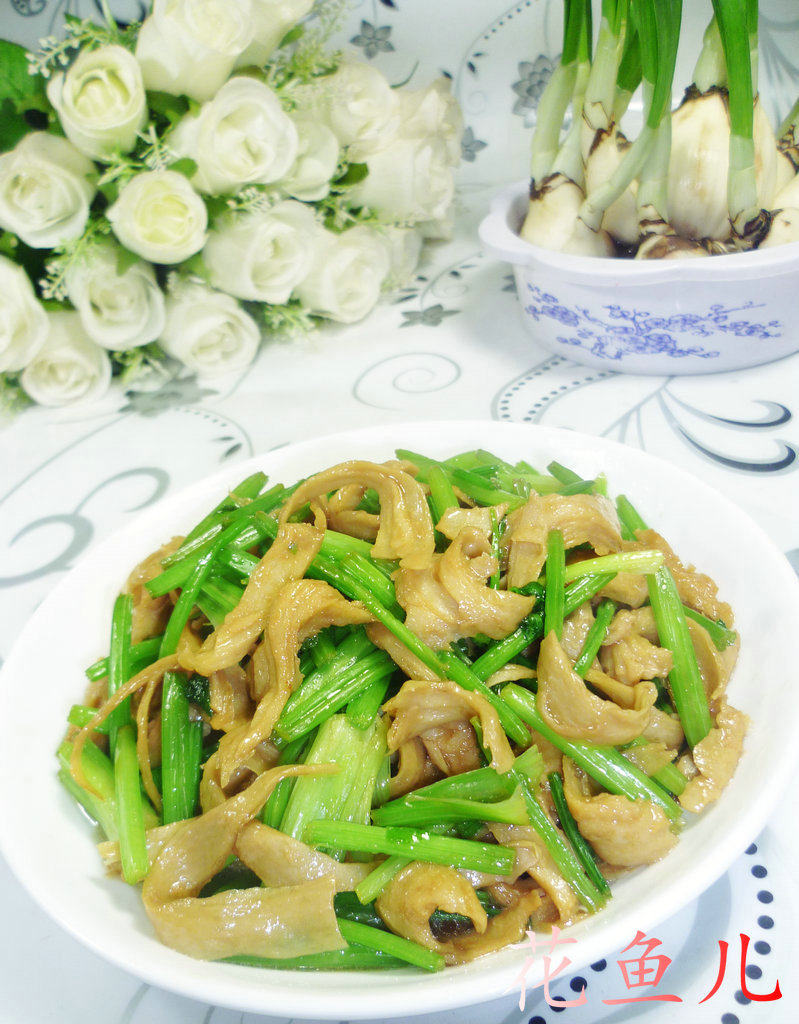 6:接着下入韭菜苔翻炒,豆筋和韭菜苔都是很容易炒熟的食物,大火快炒很快就好了。