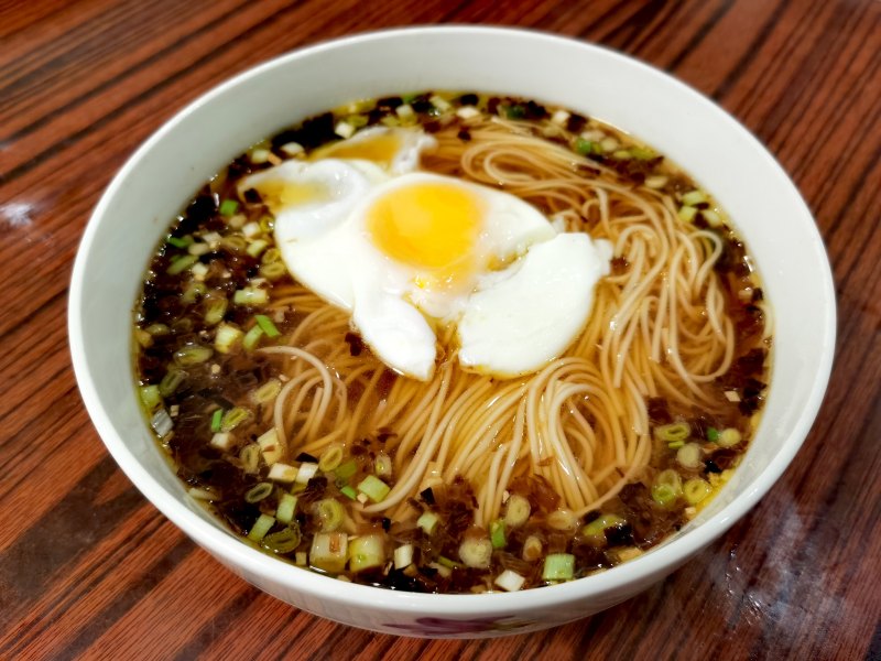 5:煮熟的面条、荷包蛋依次捞入碗中即可。