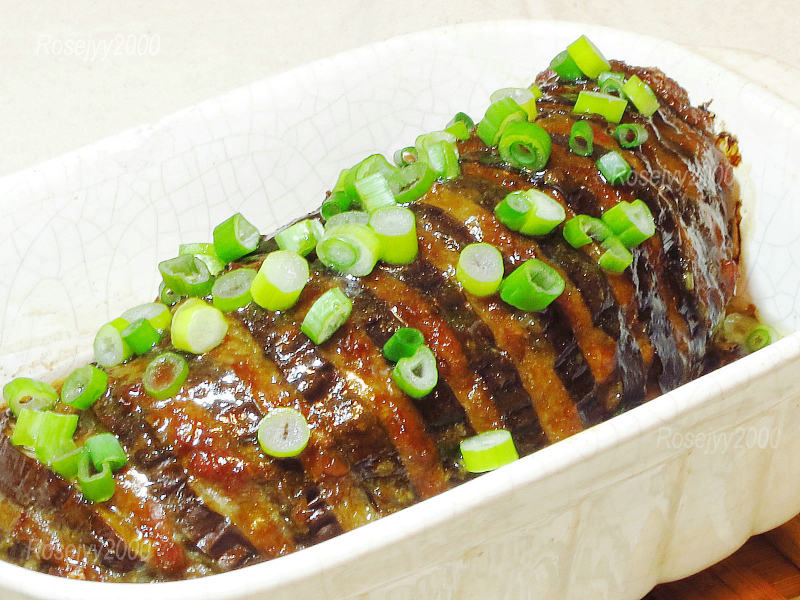 6:将茄子翻侧放入烤盘烤,425F,约30-40分钟,烤好后码在将要出品的盘子上;