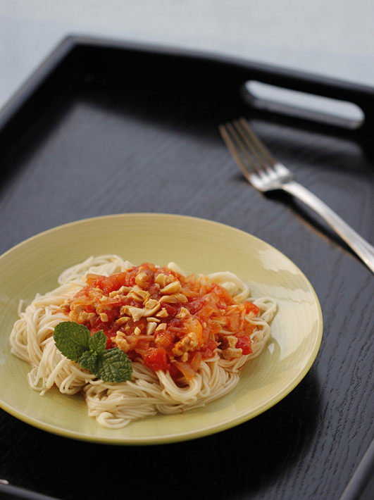 1.将里脊肉切成小丁(也可以直接用肉末),先煸炒,再下入洋葱碎一起煸炒,炒出香味且微微发软;2.再下入去皮后切成小丁的番茄,煮时要将番茄捣碎点熬煮出汁,再加入番茄酱(可以适量加入点水),熬煮浓稠时调味;3.煮面条时加入点盐能让面条不糊锅,煮好后的面条捞出后放入凉白开,不仅能很快的降温,而且避免面条粘连;4.再将面条捞出沥干水分(如果想多放点时间可以加入点油搅拌均匀),将适量的面条放入盘中,上面浇上番茄酱汁,最后撒些花生碎即可。