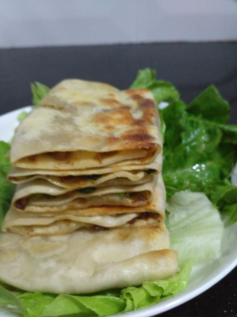 3:把面团分成4分,用擀面棍擀成25厘米正方形,抹上拌好的肉沫,用刀切成3条,把面片叠三下,即可,下锅煎。
