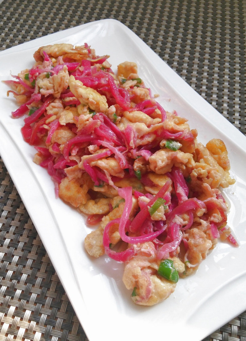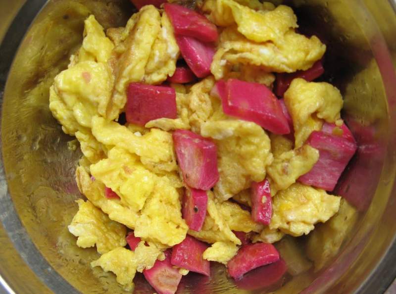 6:把鸡蛋和火龙果皮一起炒,加味精,糖,盐。