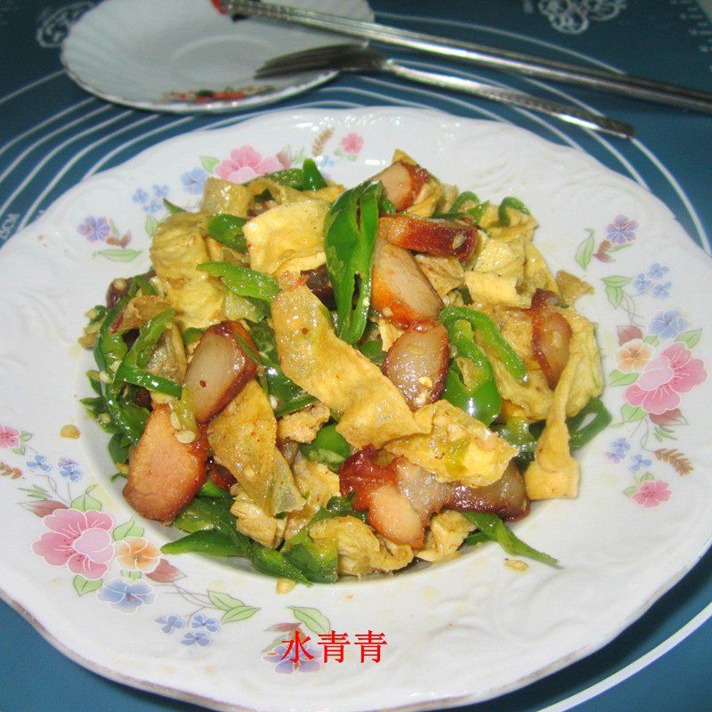 1:蛋皮,腊肉,青椒。